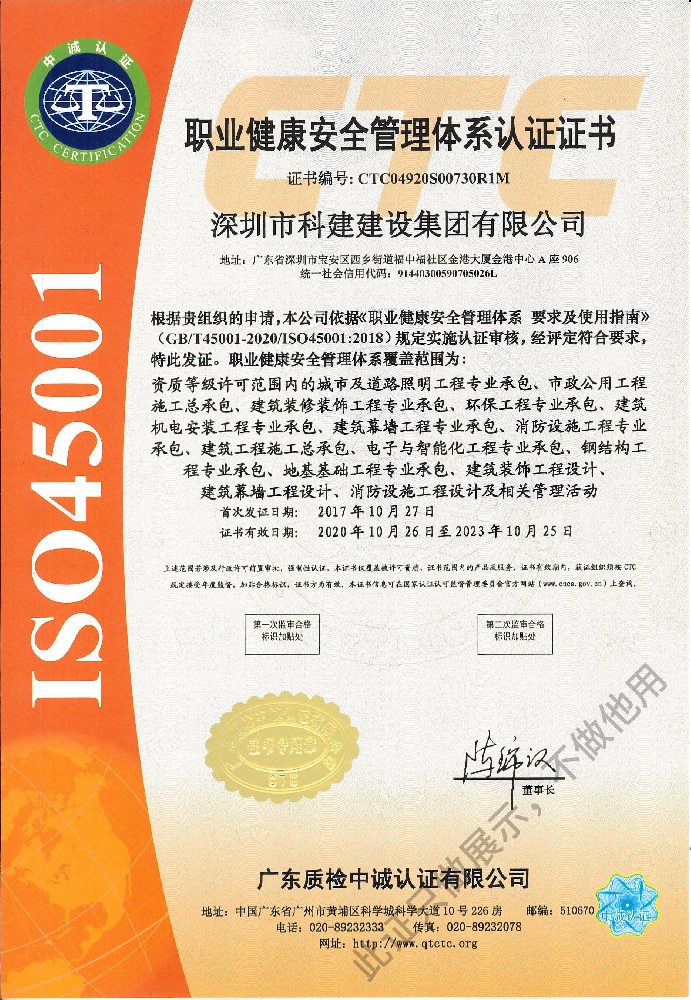 职业健康安全管理体系认证证书