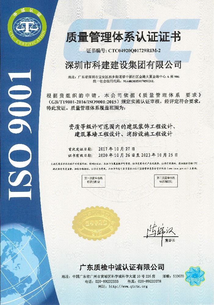 质量管理体系认证证书(施工)